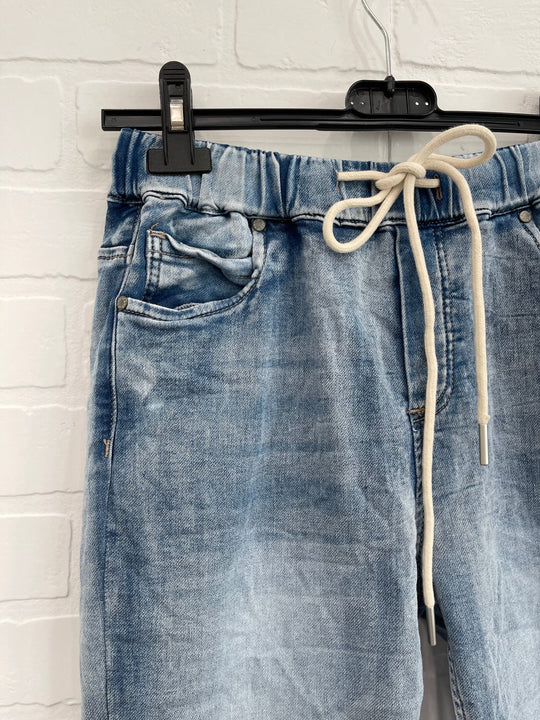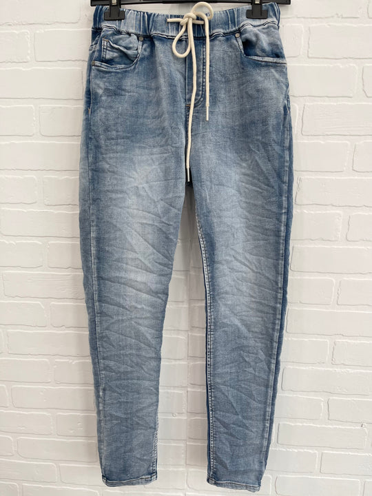 Introducing our versatile jeans designed for both comfort and style. Crafted with meticulous attention to detail, these jeans feature an elasticized waistband and drawstring, offering a customizable fit that embraces your body's contours. The unique crinkle look adds a touch of texture and modernity to the classic design.
