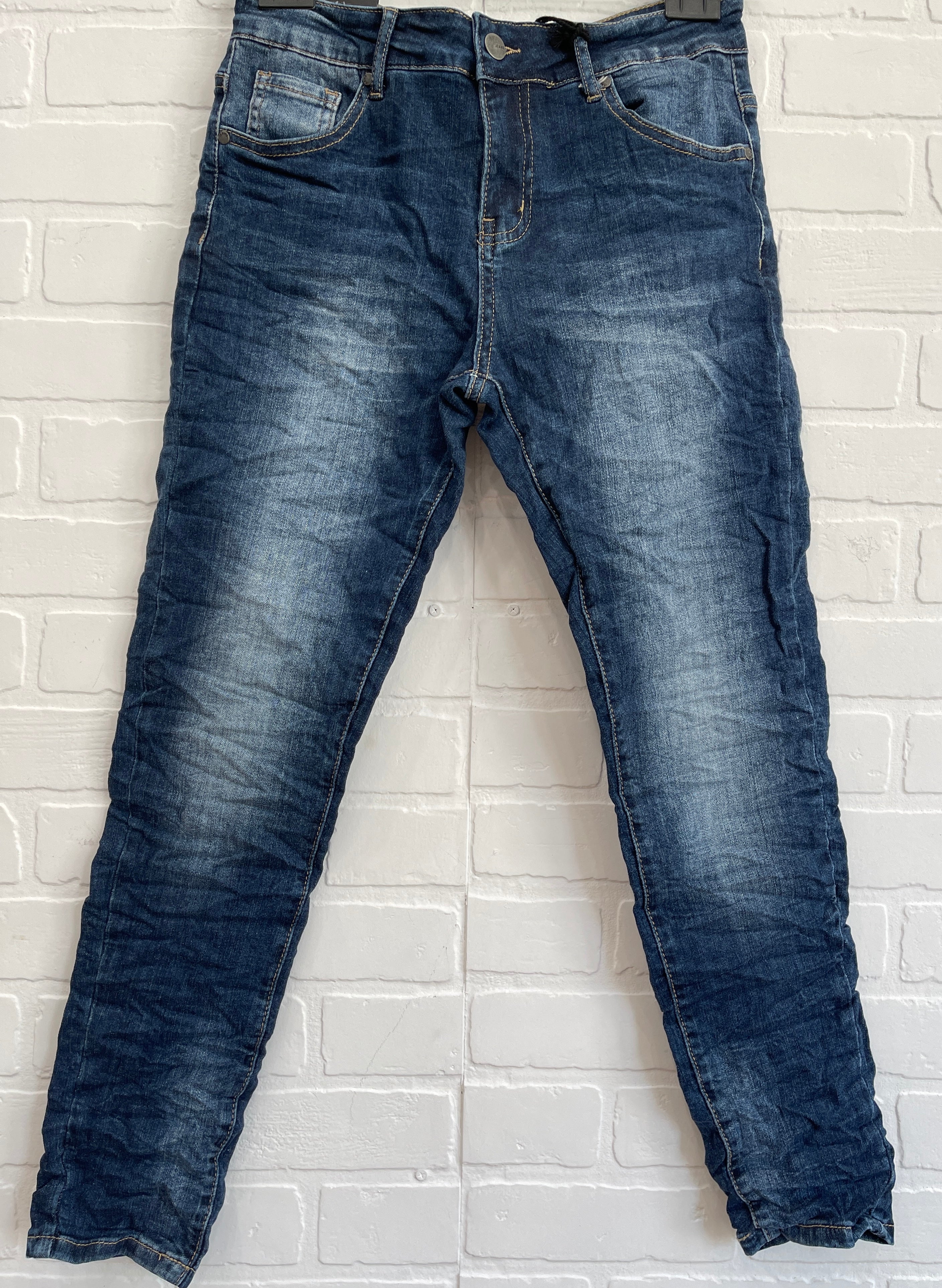 Our premium wide-leg jeans with a medium wash and high waist are versatile and can be dressed up or down. They offer a comfortable fit and a flattering silhouette.