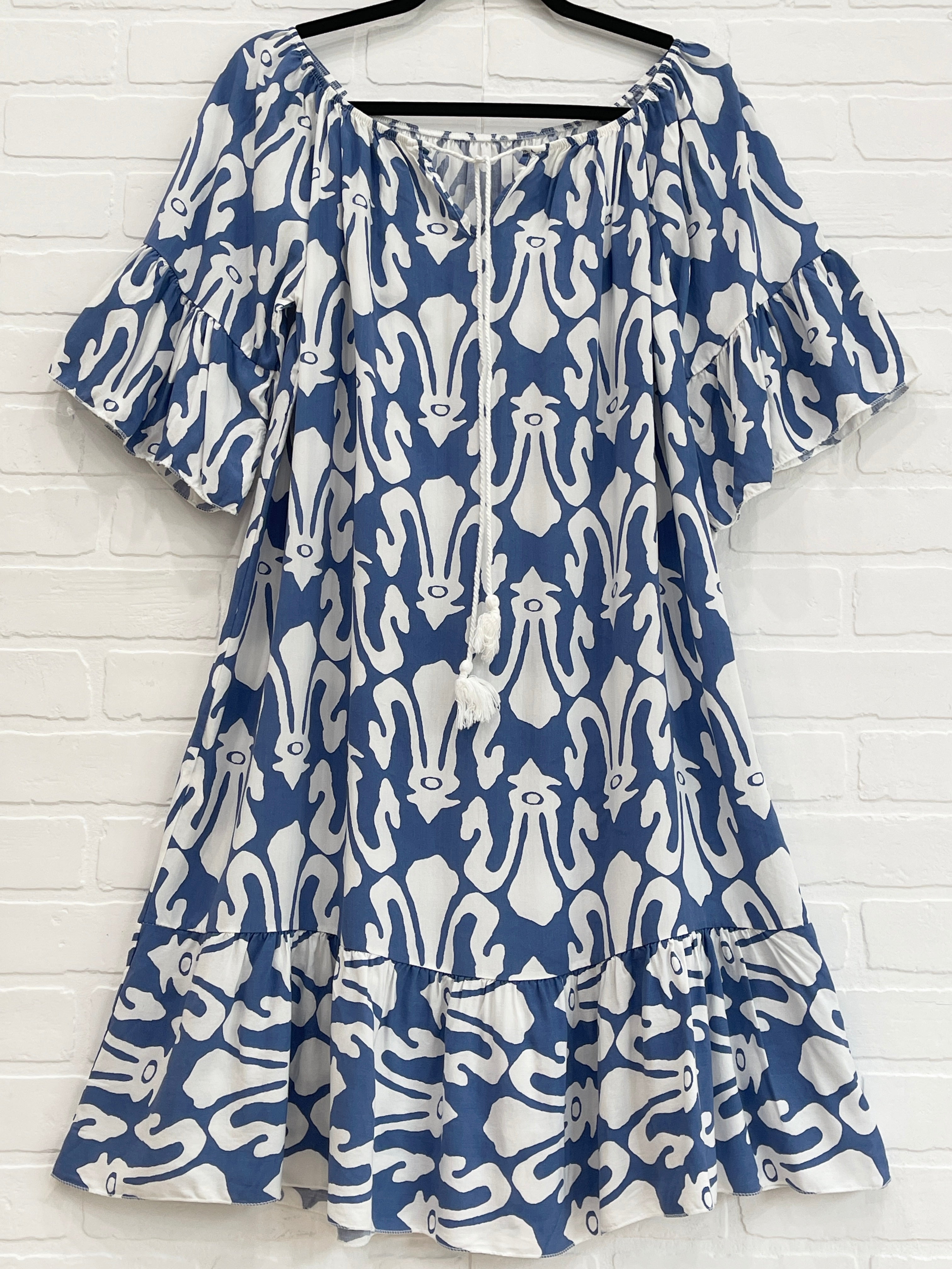 Our beautiful, abstract print midi Delilah dress features an elegant u-shape and tie at back and drop shoulders for a smooth, relaxed fit. The elastic waist allows for comfort and flexibility. A great choice for any event or outing.