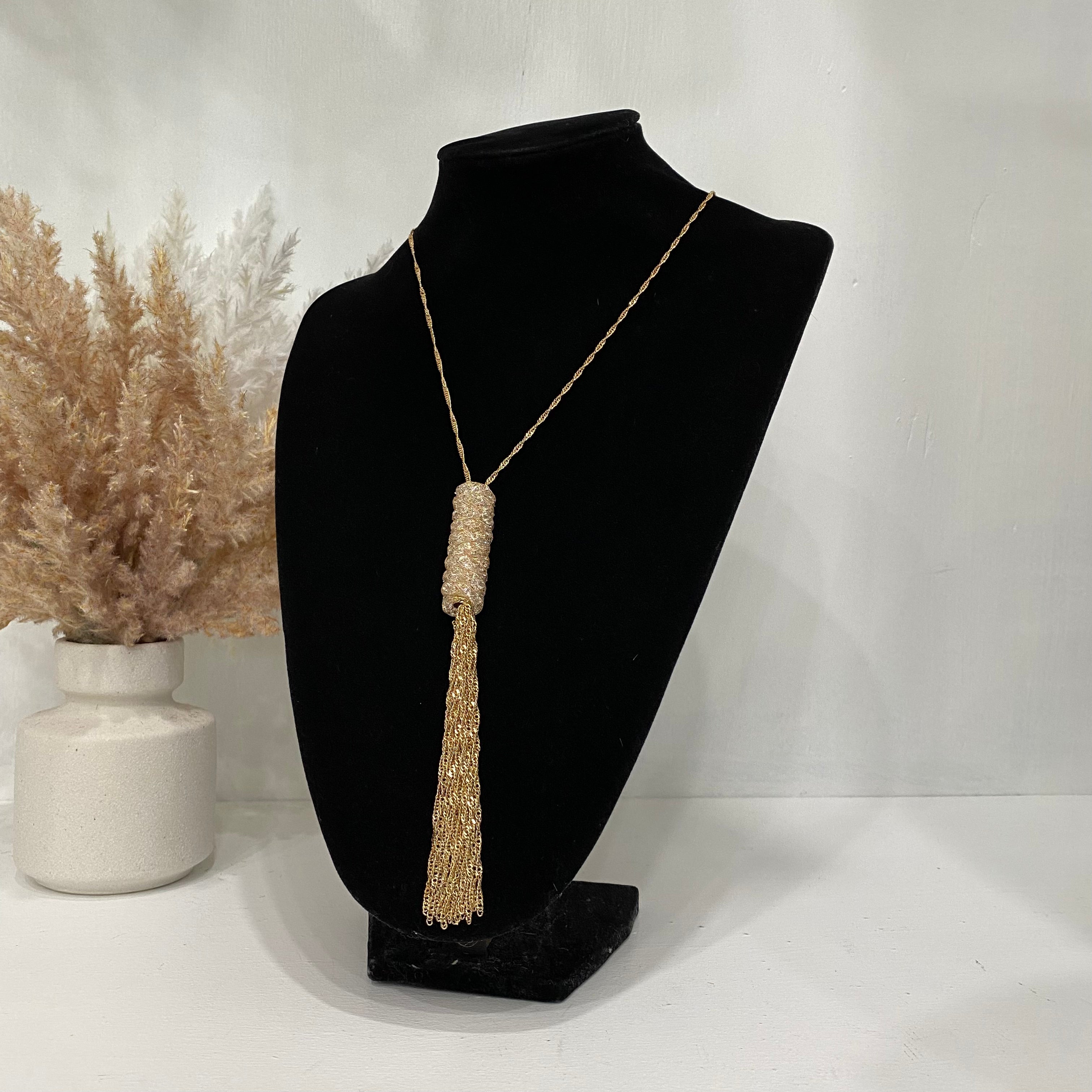 Rose gold necklace that has a pendant and multiple chains hanging from it