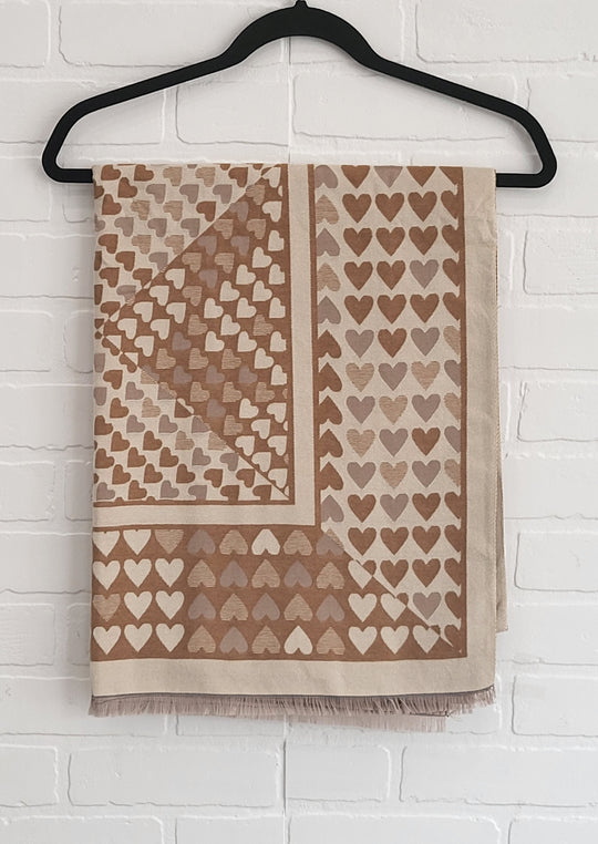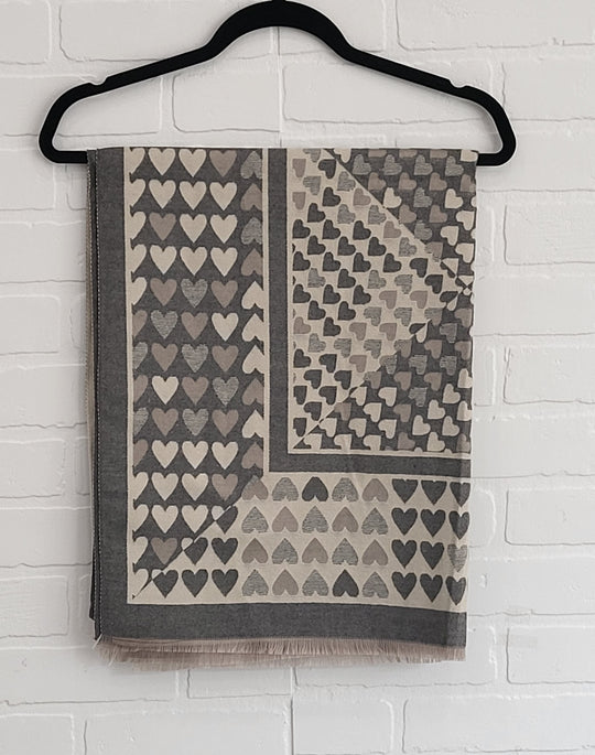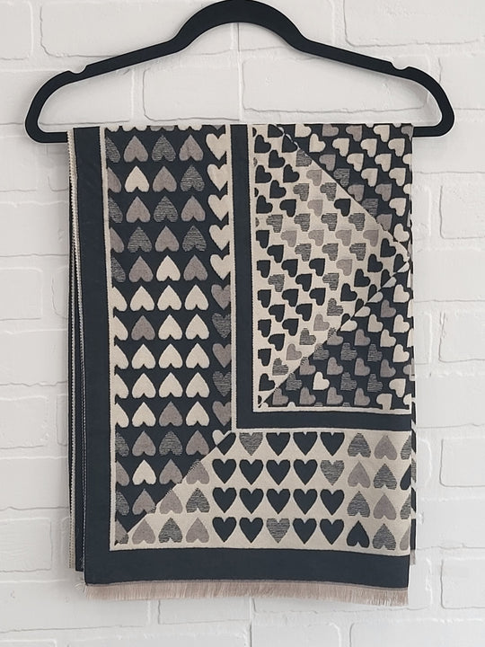 This ultra-soft scarf with a geometric heart design is the perfect accessory for fall. With its cozy texture and unique pattern, it adds a touch of warmth and style to any autumn outfit. A versatile must-have for layering and enhancing your seasonal looks.