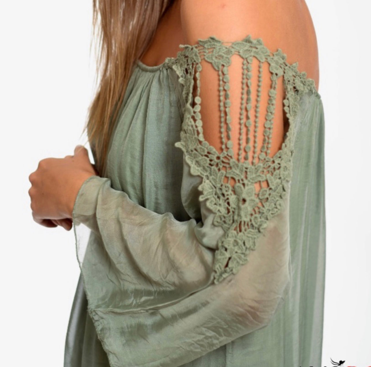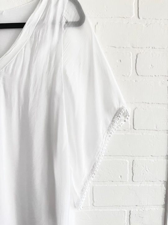 Faites l'expérience du luxe et de la sophistication avec notre haut à col en V, orné d'une délicate bordure en dentelle et confectionné dans un tissu en soie mélangée. Les manches amples offrent un drapé confortable et élégant, ce qui en fait un complément parfait à votre garde-robe. Conçue pour s'adapter aux tailles petites et moyennes, cette merveille taille unique respire l'élégance et la polyvalence. Fabriqué de manière experte en Italie, ce haut capture l'essence de l'artisanat et de la mode italienne. Élevez votre style avec cette pièce exquise qui allie harmonieusement confort et sophistication chic.