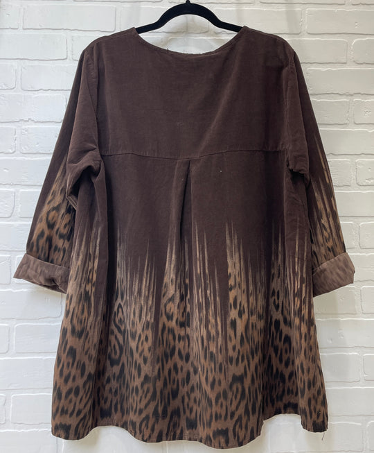 Crafted from soft, fine wale corduroy, this tunic offers a perfect balance of texture and elegance. Featuring a coconut button tie detail at the neckline, it adds a natural, rustic charm to the design. The tunic is elevated with a playful leopard print bottom, offering a bold contrast that adds personality and style to this versatile piece. Whether paired with leggings or jeans, this tunic is perfect for casual outings or cozy days.