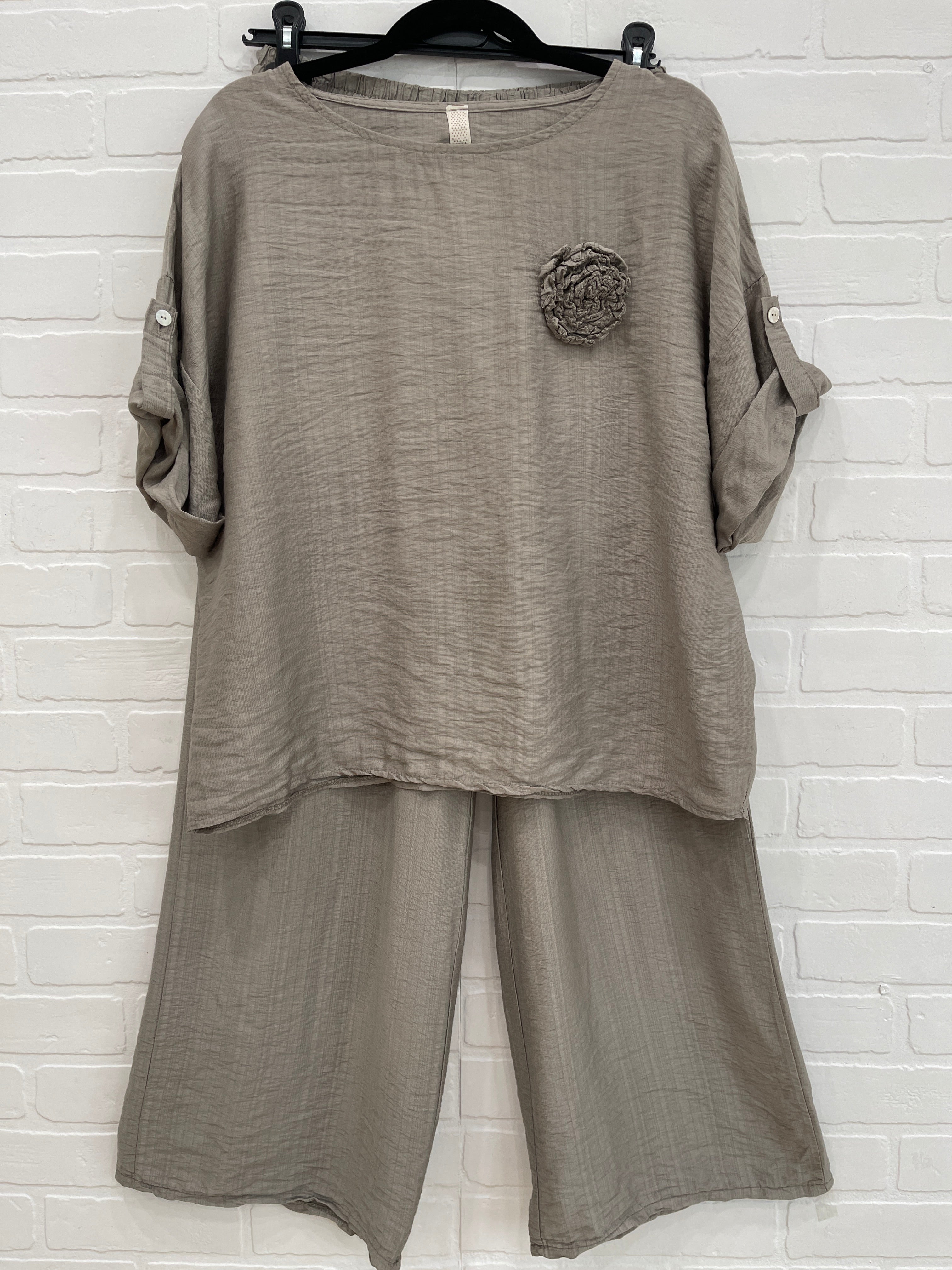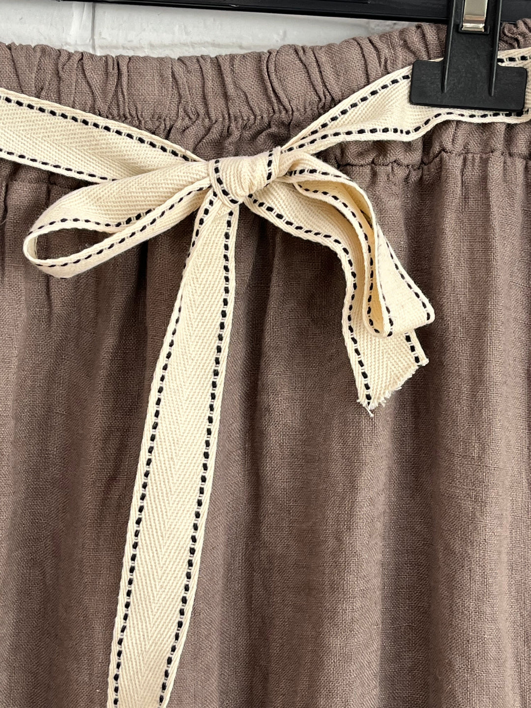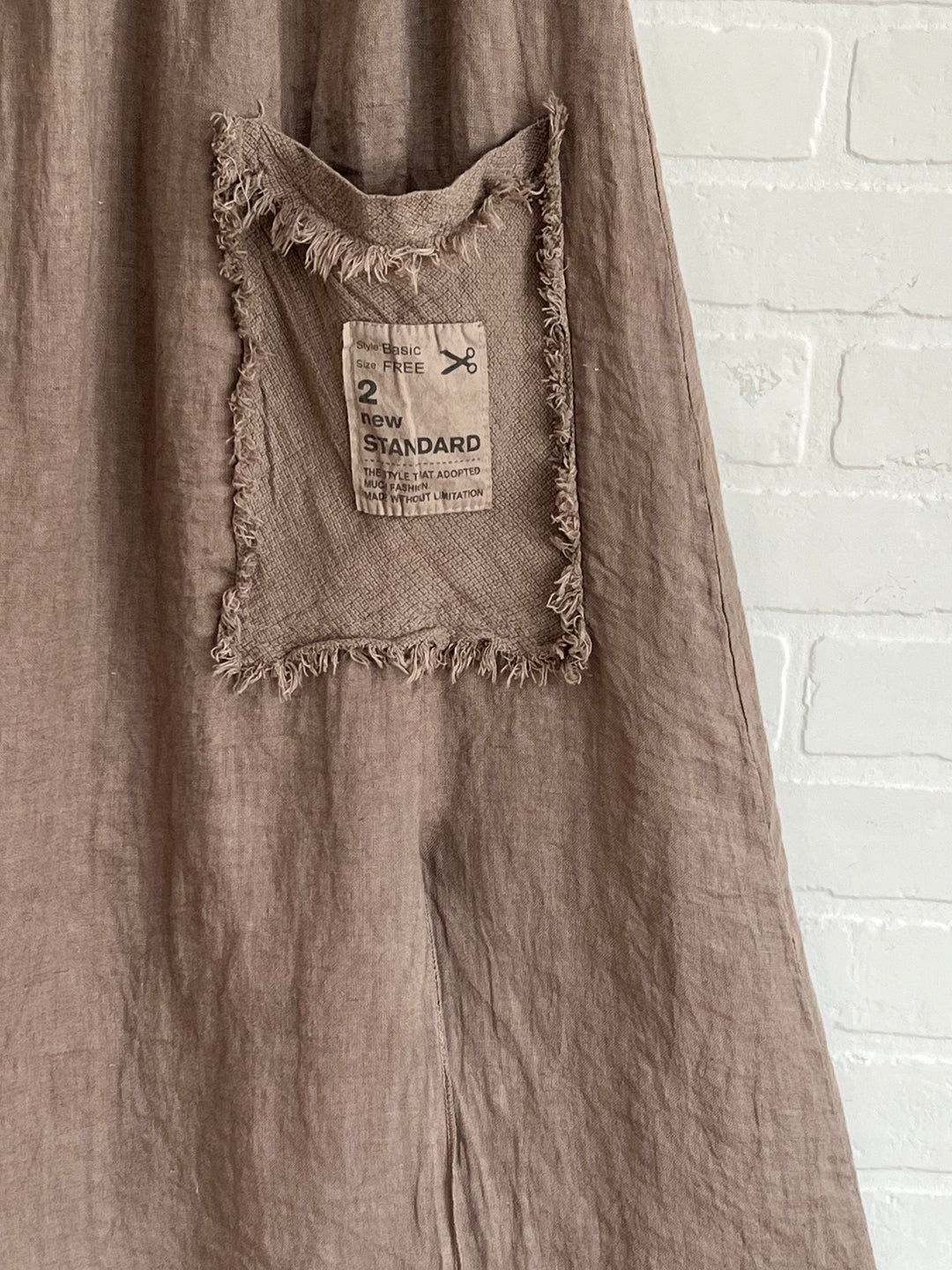 Introducing our unique two-piece set crafted from cool, breezy 100% linen fabric. This set includes a top with raw edge detailing, ensuring a relaxed and effortless look. The loose and comfortable fit pairs perfectly with the matching skirt, featuring two front slits and a functioning pocket with raw edge finishes. Complete the look with the included ribbon belt for a stylish touch. Perfect for those seeking both comfort and elegance.