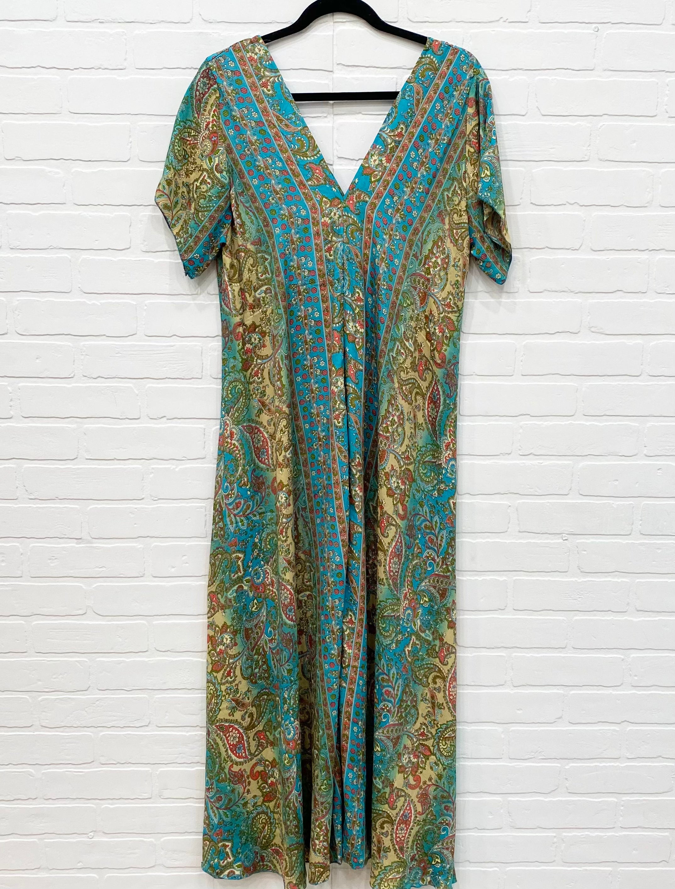 Découvrez la féérie de notre robe longue indienne en soie, chef d'œuvre d'élégance et de confort. Confectionnée avec soin, cette robe présente une taille élastiquée qui assure un ajustement parfait tout en épousant vos courbes. Les manches amples ajoutent une touche de grâce, tandis que la taille empire crée une silhouette flatteuse qui incarne la beauté intemporelle.