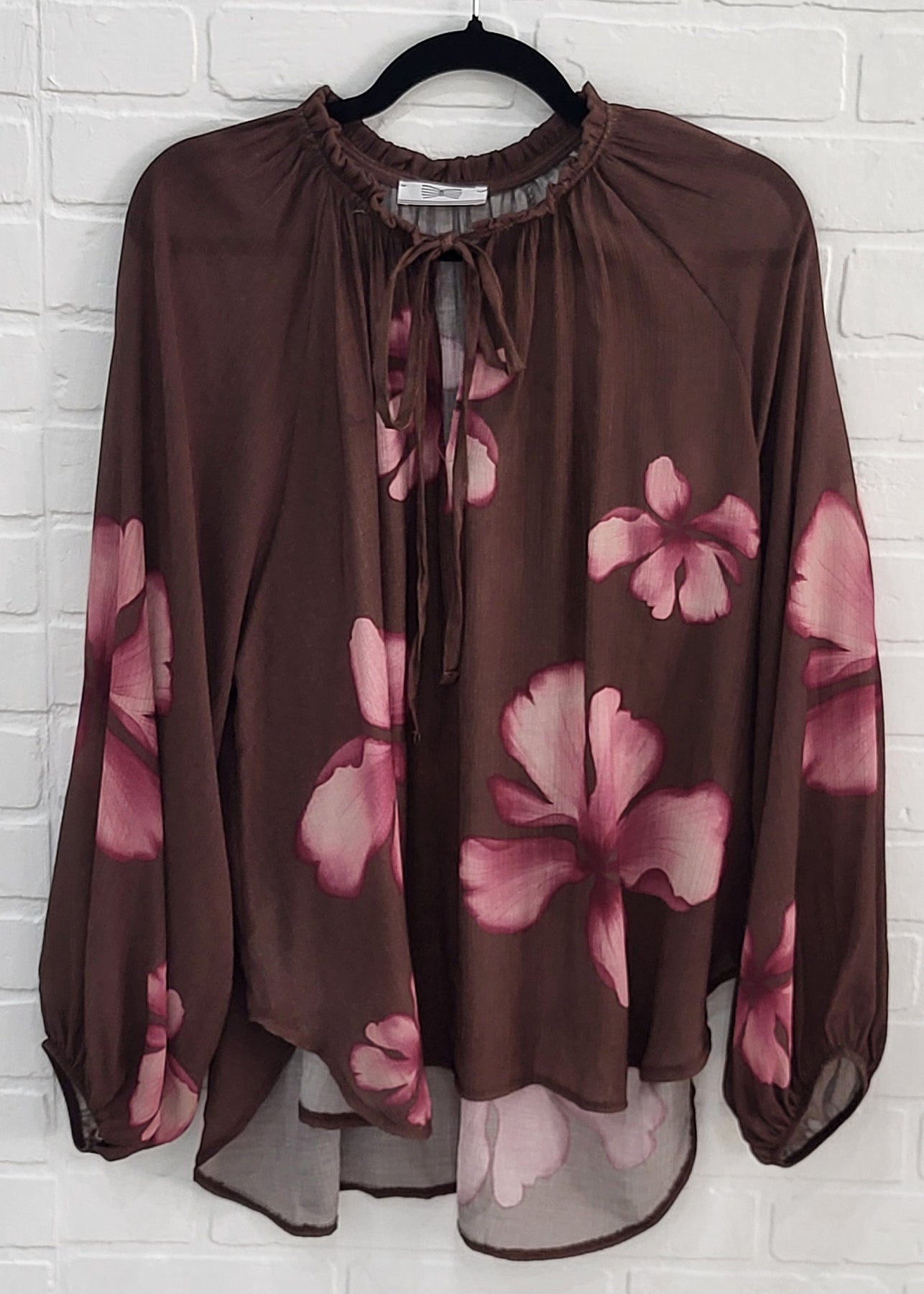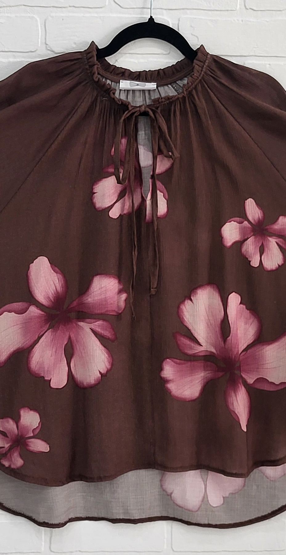 Bring effortless romance to your wardrobe with the Mocha Blossom Peasant Blouse, designed and made in Italy. This lightweight top features a rich mocha-brown base accented with soft pink oversized floral prints, giving it a feminine yet modern touch.