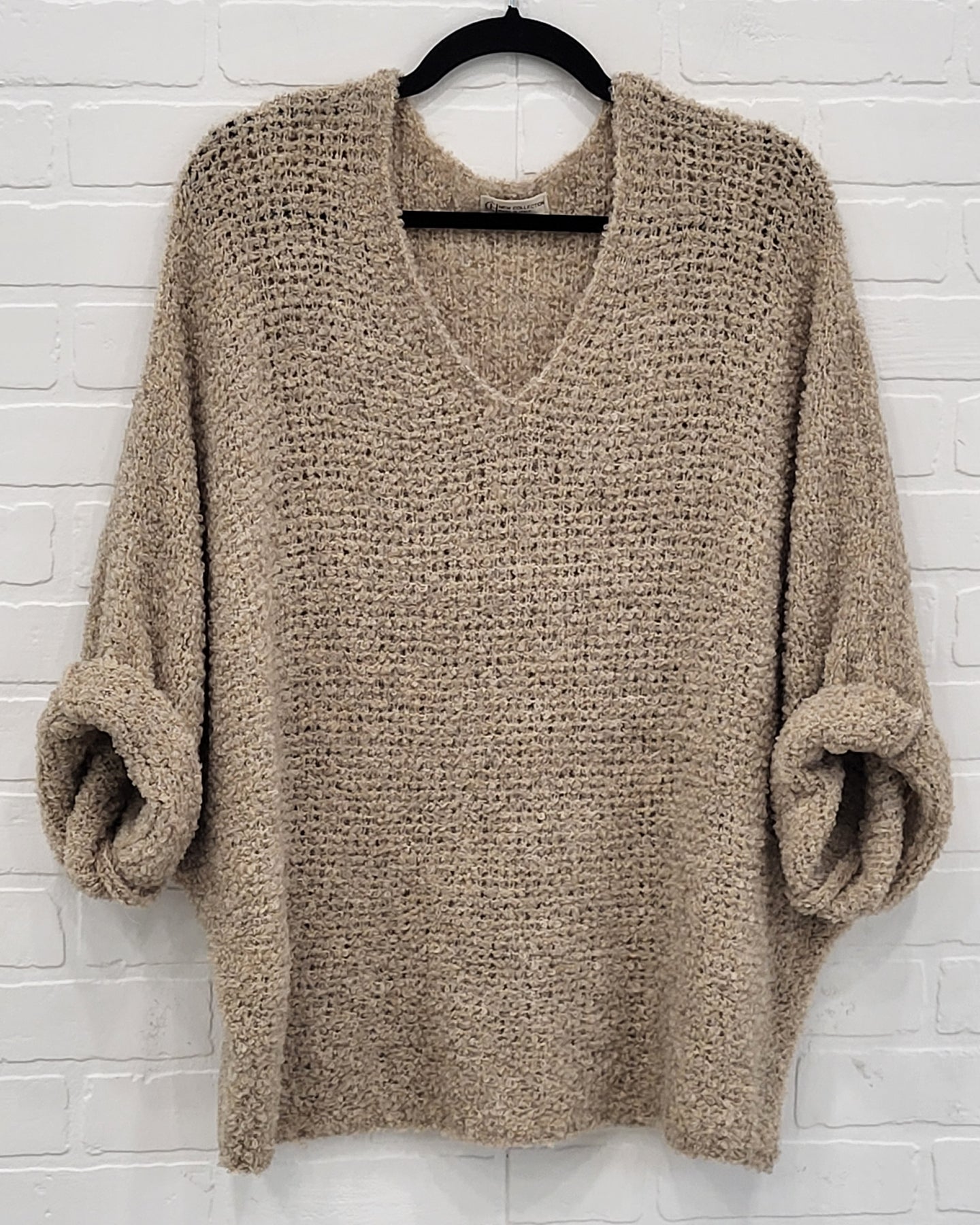 This chunky, cozy oversized sweater is the ultimate sweater weather essential. Featuring a flattering V-neck and a relaxed fit, it offers both warmth and style. Perfect for casual days filled with lunch dates, walks in the crisp air, or running errands, this versatile piece will quickly become your go-to layer. Its soft, breathable fabric keeps you comfortable all day, whether you’re lounging at home or out and about. With its timeless design and cozy appeal, it’s a must-have for cooler days ahead.