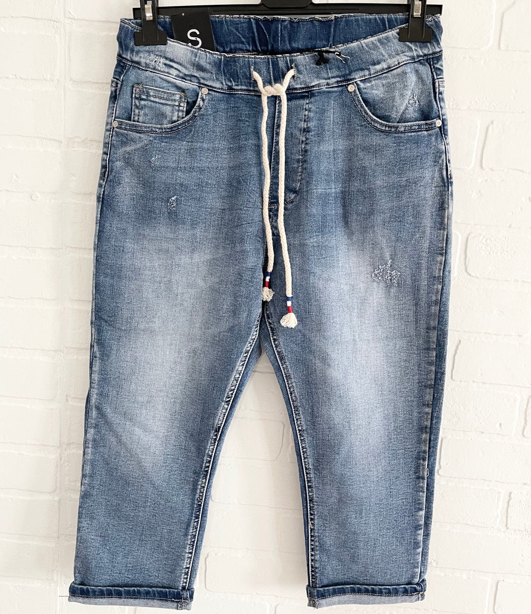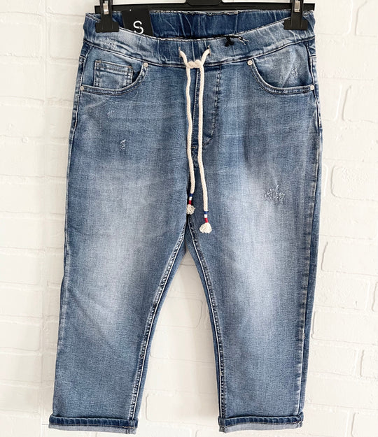 Présentation de notre jean Capri polyvalent conçu pour le confort et le style. Confectionné avec une attention méticuleuse aux détails, ce jean est doté d'une taille élastique et d'un cordon de serrage, offrant une coupe personnalisable qui épouse les contours de votre corps. L'aspect froissé unique ajoute une touche de texture et de modernité au design classique.