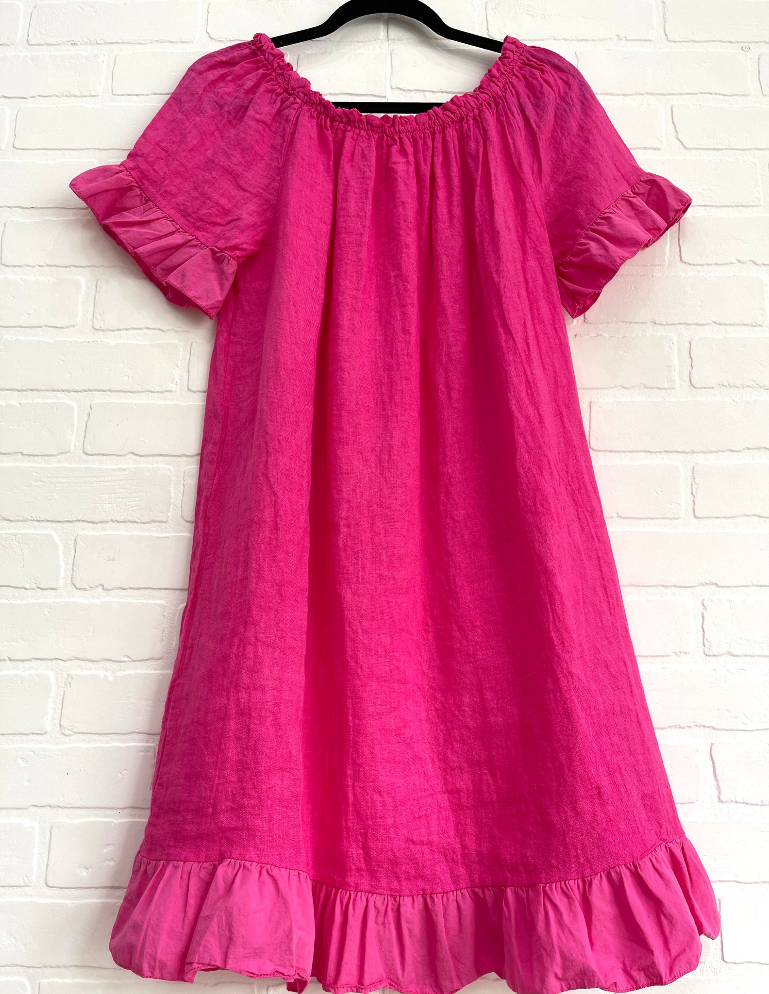 Effortlessly feminine and airy, this linen dress features a versatile elasticized neckline that allows you to wear it as a wide boat neck or gently draped for a shoulder-baring look. With ruffle-trimmed sleeves and hem, it brings a soft romantic feel to your warm-weather wardrobe.