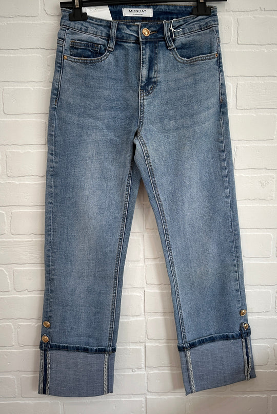 This premium denim piece features a stylish medium wash, complemented by button cuffs for added detail. Designed for comfort and ease of wear, it boasts a low-waisted, straight cut that ensures a flattering fit. Perfect for both casual and slightly dressier occasions, these jeans are a versatile addition to any wardrobe.